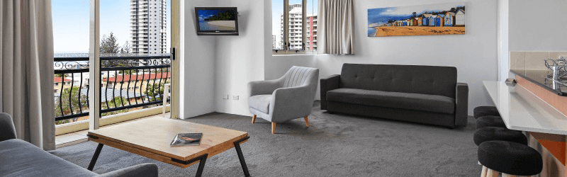 Enjoy the extra space of the renovated one plus bedroom superior apartment. The stylish and contemporary décor features a comfortable lounge setting and a double sofabed. The modern kitchen provides full cooking facilities and modern stainless steel appliances. A separate laundry and spacious 2-way bathroom with walk-in shower complement the design.